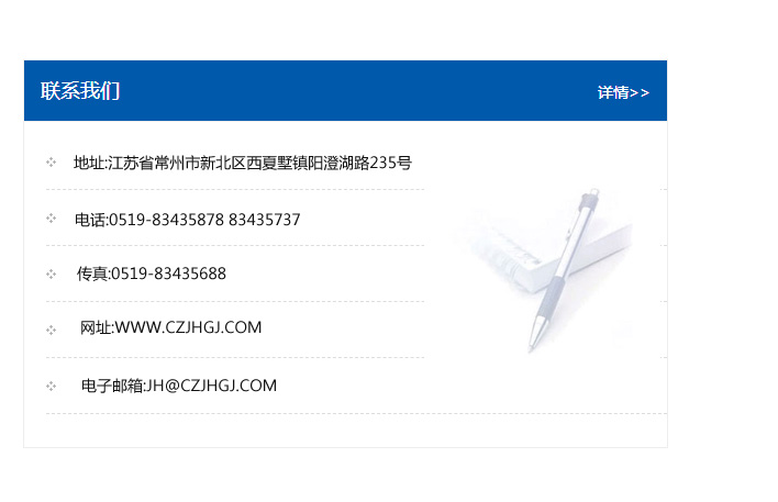 地址:常州市新北區(qū)友邦商務(wù)大廈1幢16、17層  電話:0519-85101652  傳真:0519-85112595  郵編:213022  網(wǎng)址:www_cz-jiayue_cn.yudingchuanmei.com  郵箱:xiajifengaa@163.com